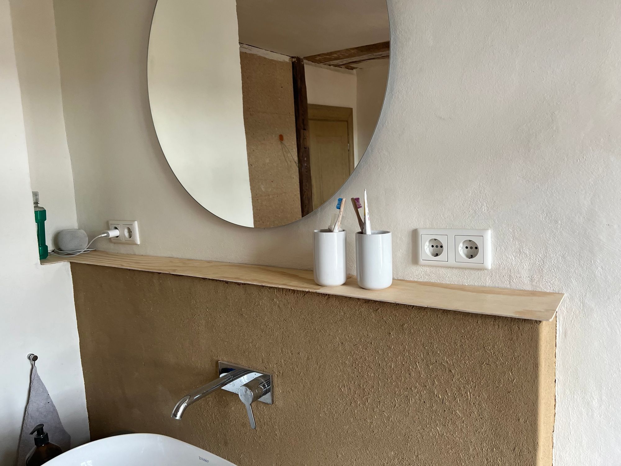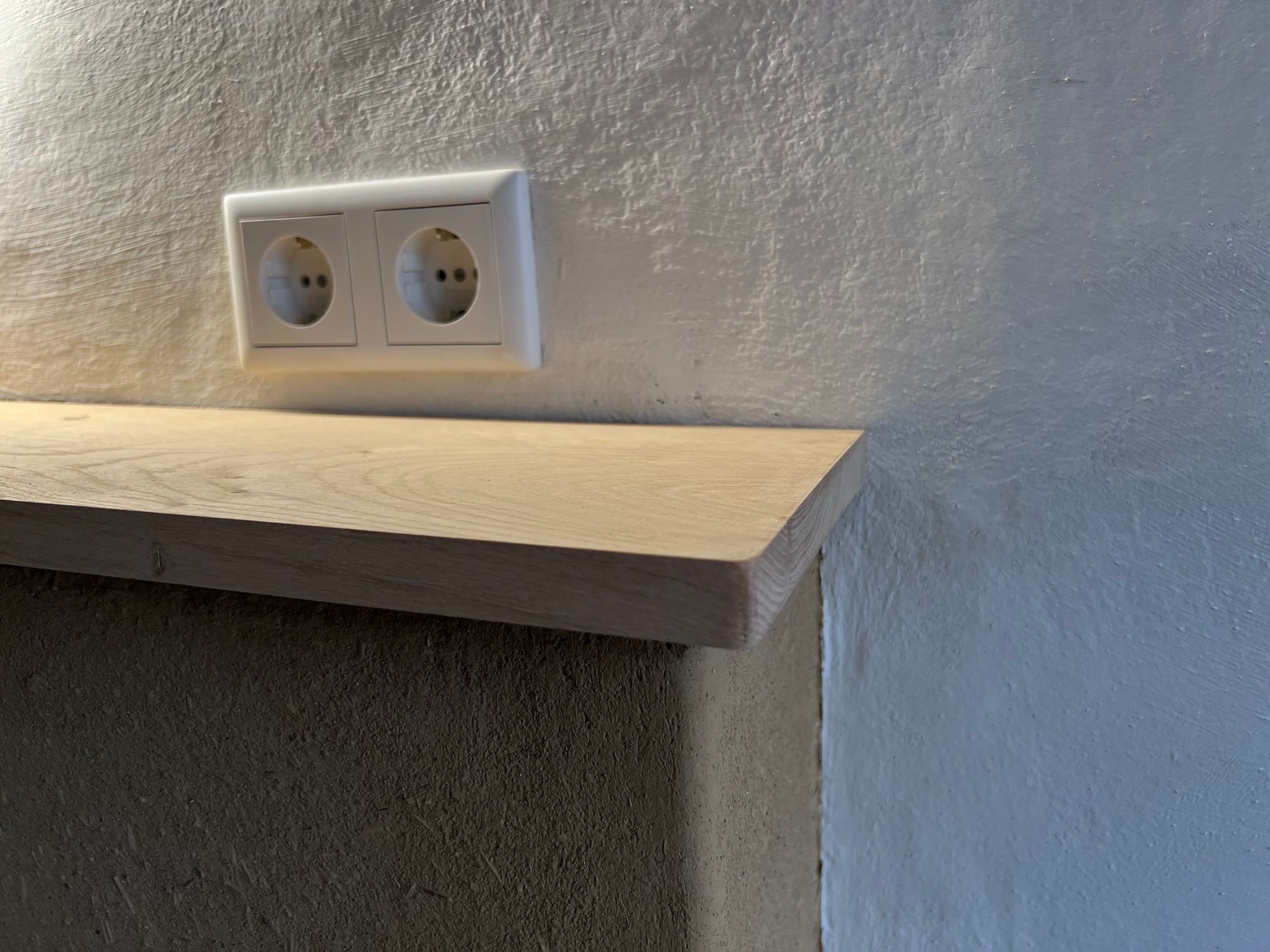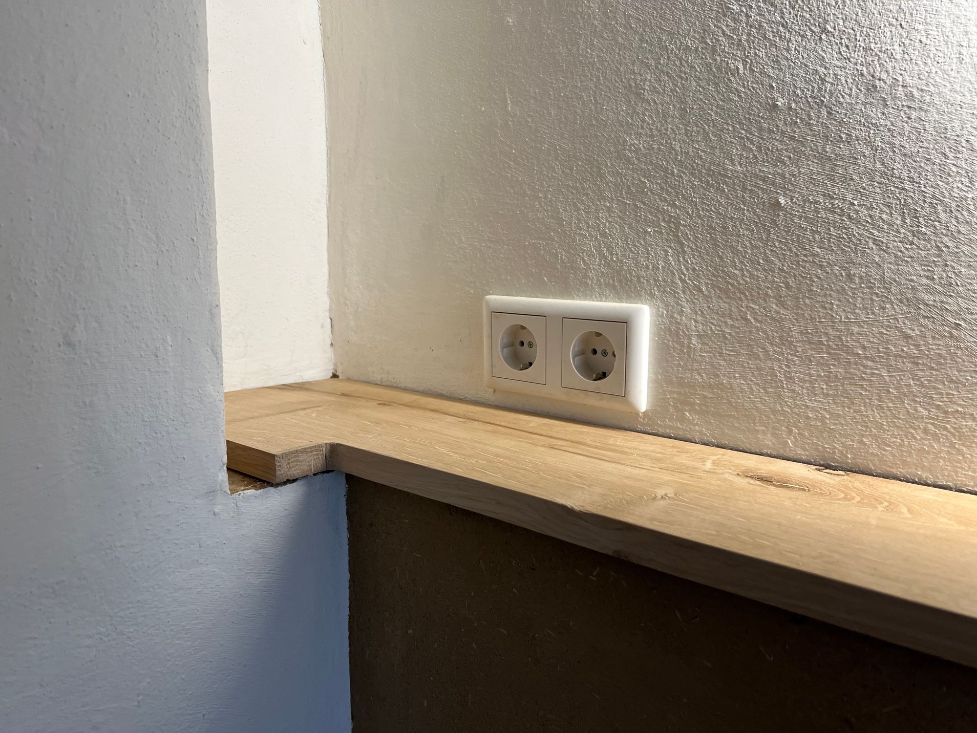 At the wash place in our bathroom we built a bit of front-wall installation to hide the plumbing and to use it as a shelf. We’ve used wood boards and clay to cover the underlying construction and always wanted to put a nice oak board on top of it. As always, things not being square and level make for another interesting puzzle challenge.