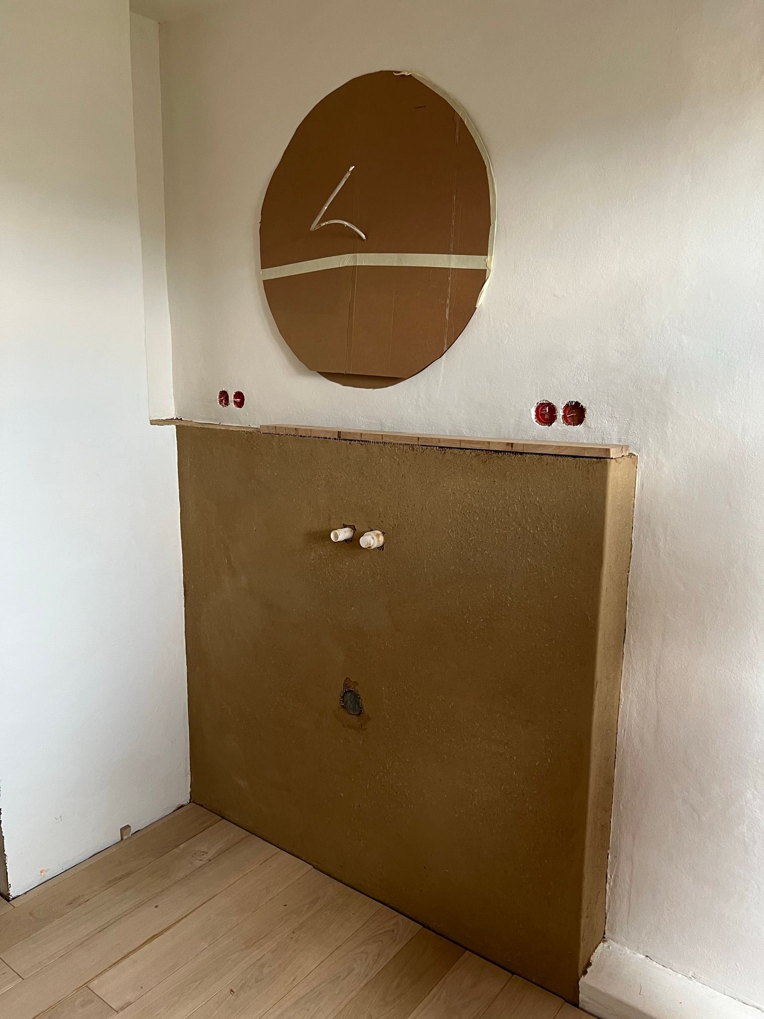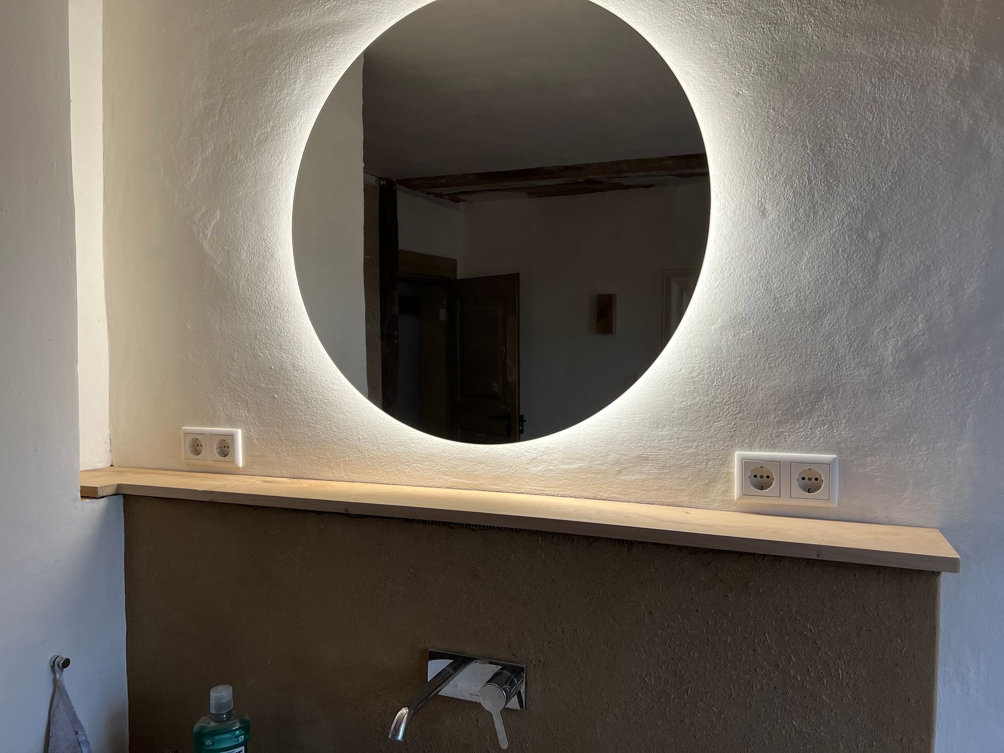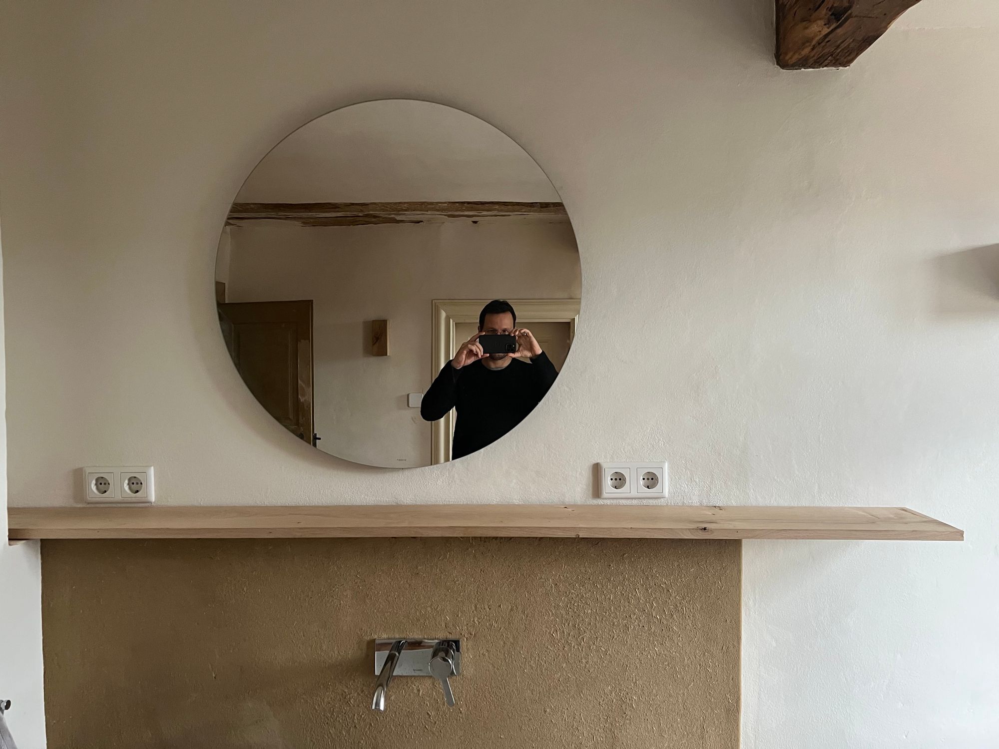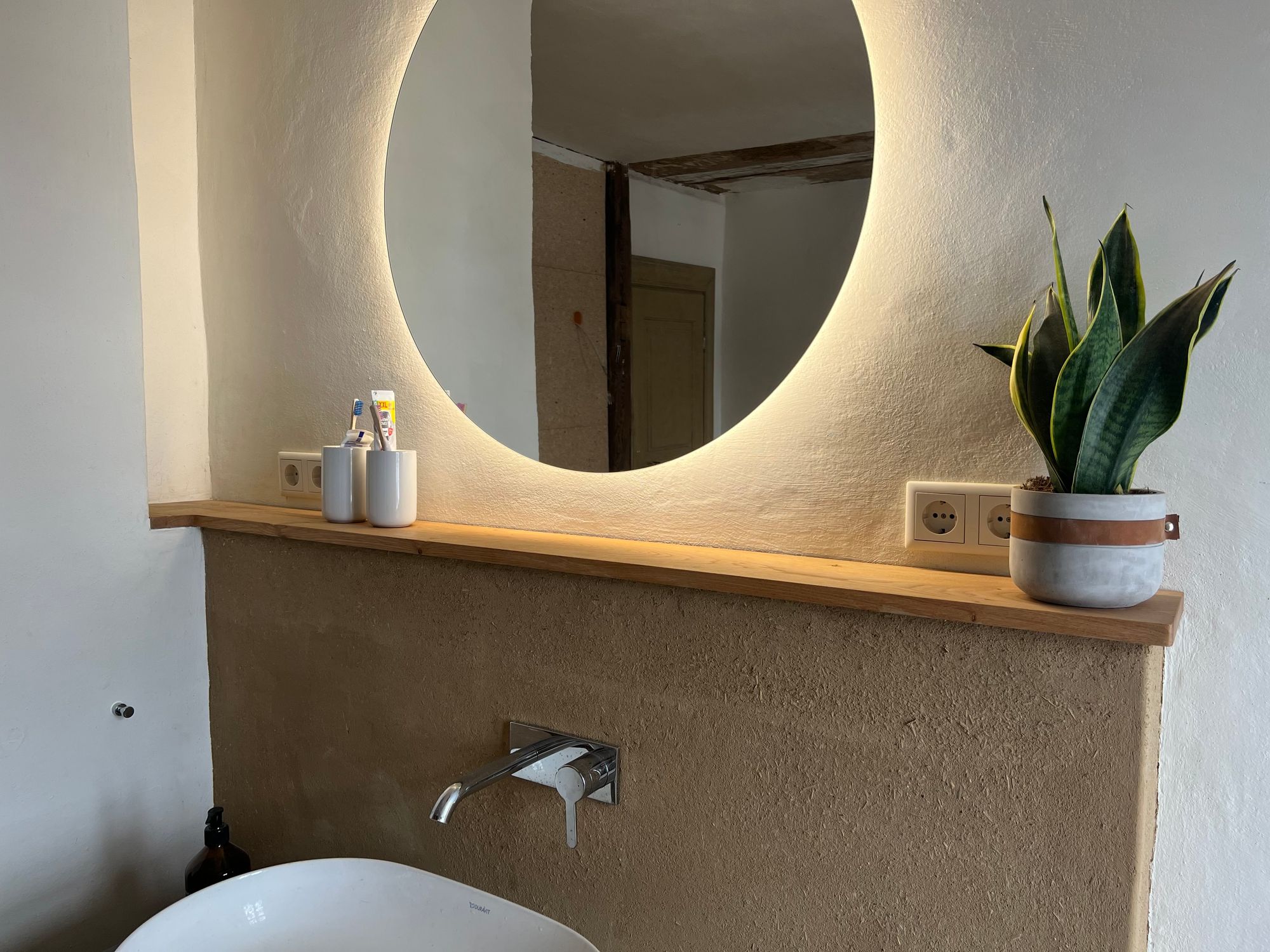 At the wash place in our bathroom we built a bit of front-wall installation to hide the plumbing and to use it as a shelf. We’ve used wood boards and clay to cover the underlying construction and always wanted to put a nice oak board on top of it. As always, things not being square and level make for another interesting puzzle challenge.